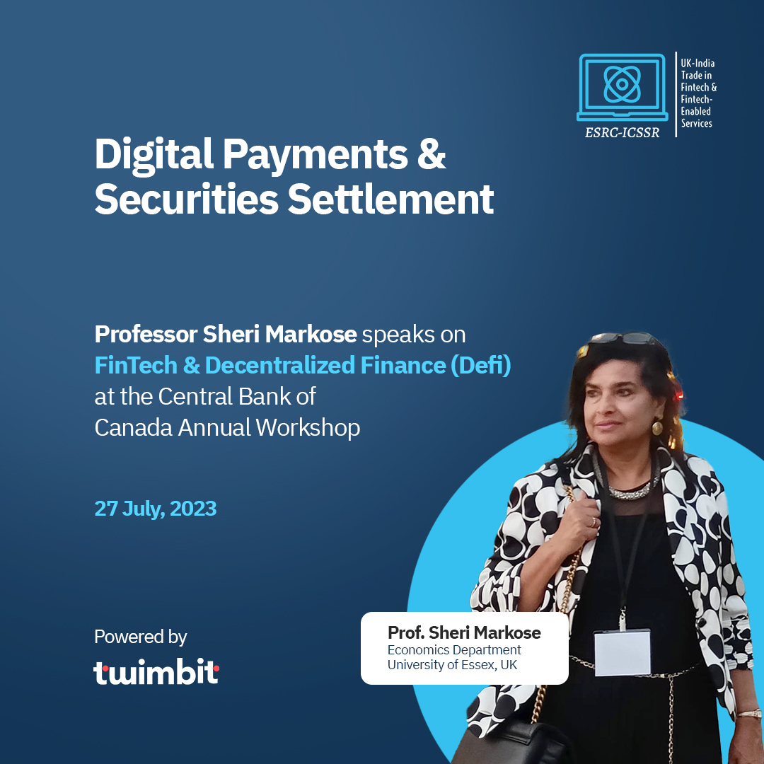- Recently, our project co-investigator Professor Sheri Markose was invited by the Central Bank of Canada in Ottawa to speak at their annual workshop on Digital Payments & Securities Settlement.